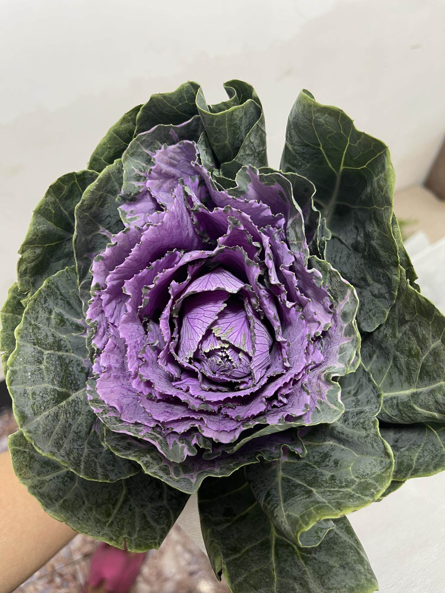 Loại hoa này phía bên ngoài sẽ được bao bọc bởi những chiếc lá xanh, còn phía trong có thể là màu tím nhạt hoặc màu trắng. Bông hoa bắp cải có đường kính rất lớn, khoảng 25 – 30cm và xòe ra nhìn rất lạ mắt.