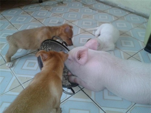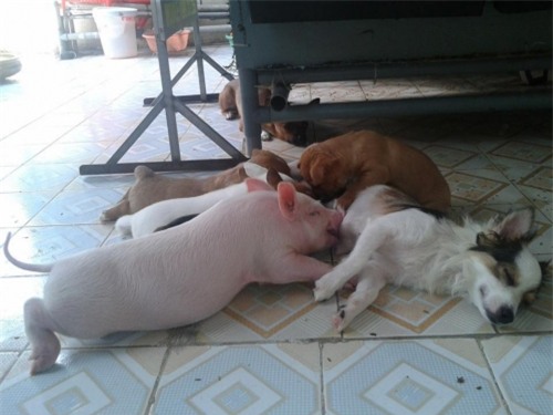 Lúc mới mua con nhợn cũng chỉ bé bằng con chó con thôi ạ, ăn cùng chó con và bú chó mẹ. Nhìn chó yêu thương lợn như anh em ruột thịt em cũng yên tâm nuôi.