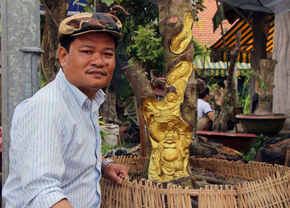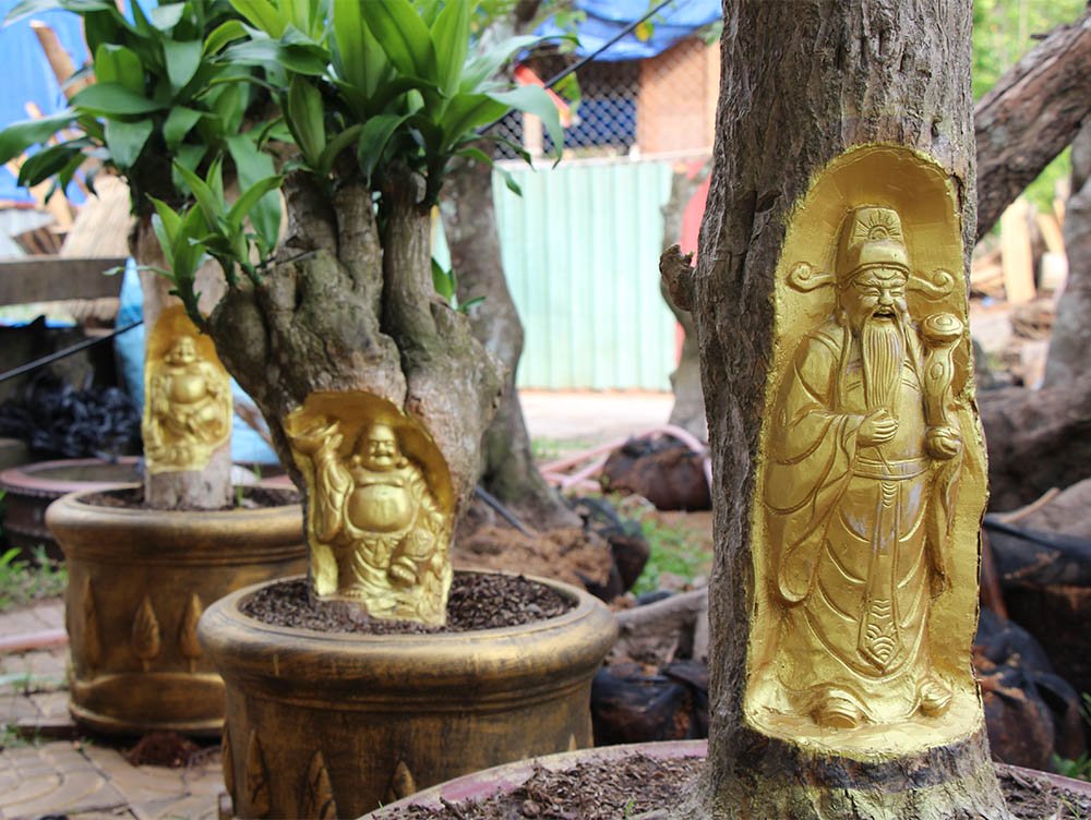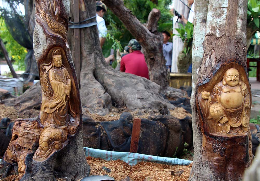 "Khi bứng cây về phải chăm sóc cho cây đủ sức sống trở lại rồi mới tạc tượng từ từ lên. Sau khi tạc tượng xong thì xử lý hóa chất cho chết phần chạm trổ trên cây, tránh trường hợp theo thời gian tượng bị biến dạng. Đây là một trong những công đoạn cực kỳ công phu, quyết định chất lượng của sản phẩm", anh Việt nói.