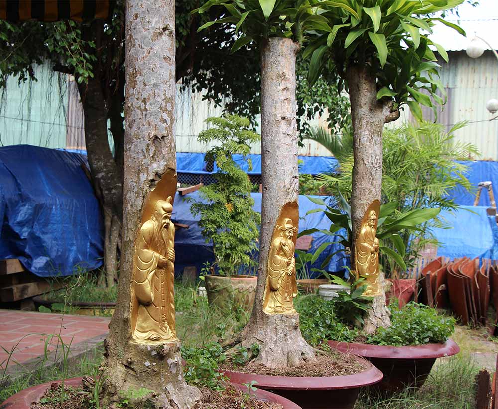 Bộ điêu khắc Phúc - Lộc - Thọ được trạm trổ trên thân cây phát tài