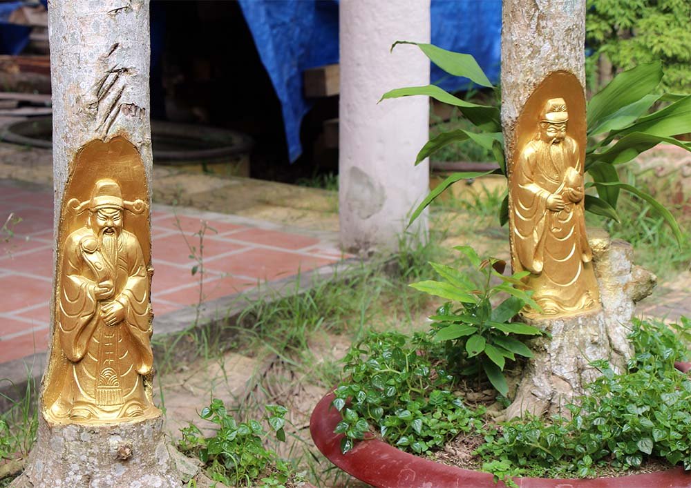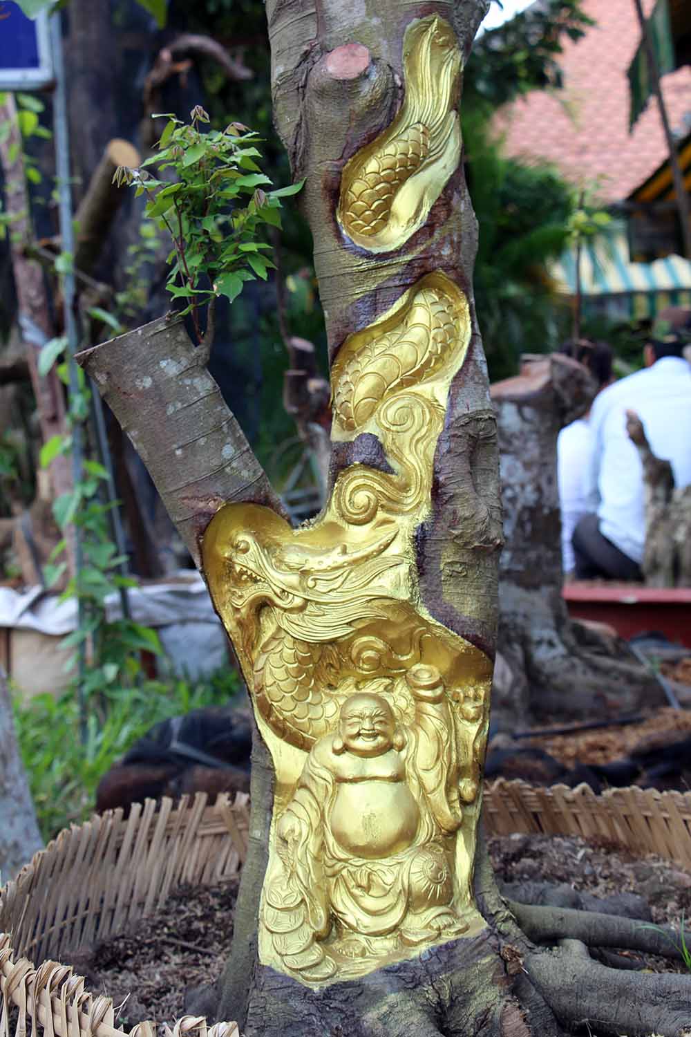 Sau khi khắc xong thì phần tượng sẽ được phủ lớp keo và sơn nhũ vàng chuyên dụng để da cây liền lại, giữ được đường nét lâu dài, cây sẽ đâm chồi và tiếp tục sinh trưởng.