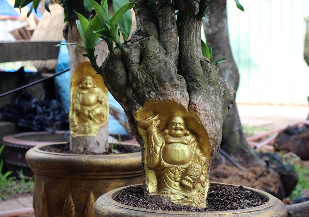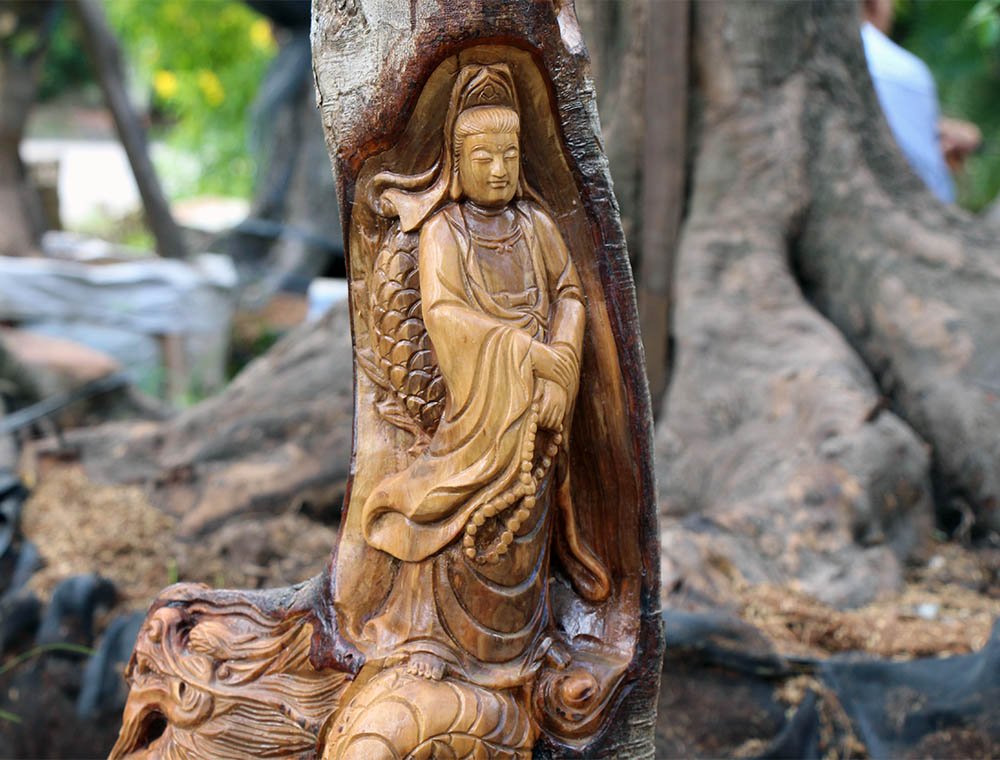 Bằng đôi bàn tay điêu luyện, tỉ mỉ, trên những thân cây phát tài, cây khế, anh Việt đã khắc thành hình ông Di Lặc tay cầm thỏi vàng thân hình mập mạp, phúc hậu với nụ cười hoan hỷ đặc trưng hay ba ông Phước - Lộc - Thọ vẻ mặt tươi vui, sinh động như mang niềm hạnh phúc đến cho mọi người. Tất cả những tượng này đều được trạm trổ thẳng lên cây.