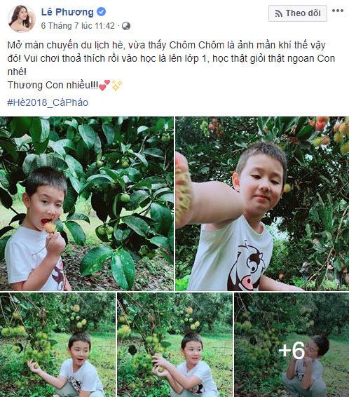 Trên facebook cá nhân, nữ diễn viên còn hào hứng chia sẻ anh chuyến du lịch cùng lời chú thích cho biết: “Mở màn chuyến du lịch hè, vừa thấy Chôm Chôm là ảnh mần khí thế vậy đó! Vui chơi thoả thích rồi vào học là lên lớp 1, học thật giỏi thật ngoan Con nhé!”.