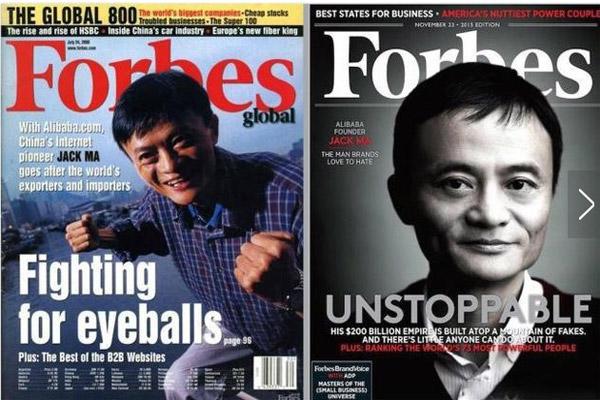 Jack Ma trở thành doanh nhân Trung Quốc đầu tiên xuất hiện trên trang bìa tạp chí Forbes. Tờ tạp chí danh tiếng này từng mô tả ông như “một đứa trẻ bướng bỉnh, má hóp, đầu tóc bù xù, cười hở lợi, cao mét rưỡi và nặng khoảng 50 cân”.