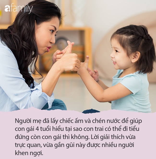 - Con đã thử và biết rồi đúng không, con gái thì không thể đi tiểu đứng. Đó là vì cấu tạo bộ phận để đi vệ sinh khác nhau.