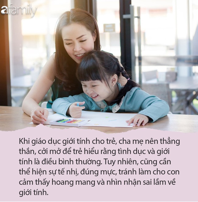 Cha mẹ khi giáo dục giới tính cho trẻ nên thẳng thắn, cởi mở để trẻ hiểu rằng tình dục và giới tính là điều bình thường. Tuy nhiên, cũng cần thể hiện sự tế nhị, đúng mực, tránh làm cho con cảm thấy hoang mang và nhìn nhận sai lầm về giới tính.