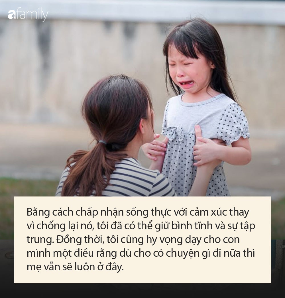 Bằng cách chấp nhận sống thực với cảm xúc thay vì chống lại nó, tôi đã có thể giữ bình tĩnh và sự tập trung. Đồng thời, tôi cũng hy vọng dạy cho con trai mình một điều rằng dù cho có chuyện gì đi nữa thì mẹ vẫn sẽ luôn ở đây. Chúng ta sẽ cùng nhau tìm đường ra cho mọi vấn đề".