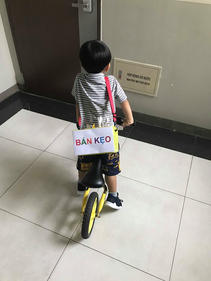 Cậu bé Măng đạp xe bán kẹo loanh quanh tầng hầm chung cư.