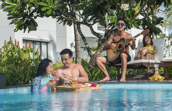 Nếu sành điệu hơn, du khách có thể đặt hàng khách sạn một bữa sáng nổi - "floating breakfast" mang phong cách Bali ngay tại bể bơi. Đừng quên diện bikini “bỏng mắt”, khoác hờ chiếc áo choàng họa tiết nhiệt đới đặc trưng của Vinpearl để mang về bức ảnh sang chảnh triệu like.