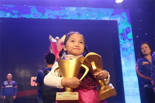 Hình ảnh kỳ thủ Nguyễn Lê Cẩm Hiền ôm 2 chiếc Cúp ấn tượng nhất trong đêm Gala