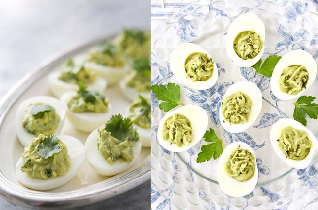 Trứng luộc cắt đôi và dùng thìa lấy nhẹ lòng đỏ ra. Trộn đều lòng đỏ trứng với bơ xay nhuyễn, mayonnaise, muối và tiêu (có thể cho hỗn hợp này vào máy xay để xay nhuyễn và đều).
