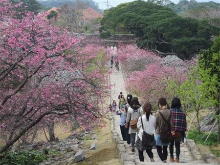 Nếu không muốn “chen vai thích cánh” trong dòng người đông đúc đổ về Yaedake dự hội, du khách có thể kết hợp tham quan lâu đài Nakijin và ngắm anh đào nở. Tại đây, những cây anh đào nhiều năm tuổi nở rộ, bao bọc công trình cổ kính của Okinawa, mang lại một vẻ đẹp hài hòa giữa thiên nhiên và kiến trúc do bàn tay con người tạo tác.