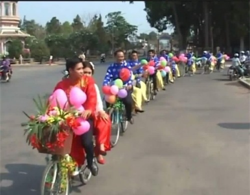 Thay vì lựa chọn các phương tiện hiện đại, cặp đôi này lại chọn dùng phương tiện truyền thống đó là chiếc xe đạp để rước dâu. Trong trang phục áo dài cô dâu chú rể và dàn xe đạp đi trên đường phố đã thu hút mọi ánh nhìn.