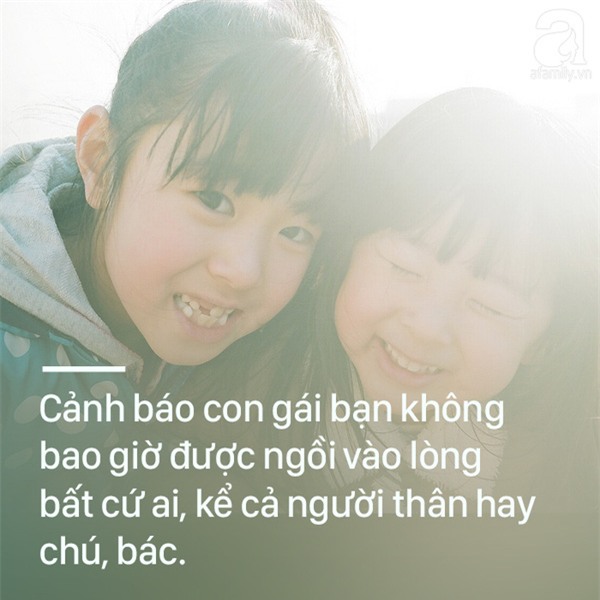 Những đứa trẻ cần sự bảo vệ nghiêm ngặt từ chính cha, mẹ của chúng. Đừng chỉ giật mình khi đọc những bản tin nói về trẻ con bị xâm hại, rồi để con được thoải mái tung tăng ăn ngủ nhà hàng xóm, nhờ ông trẻ trông cháu giúp để mẹ đi chợ, nhìn con ôm hôn bác bảo vệ ở trường mà cho rằng đấy là lễ phép... Những kẻ bệnh hoạn thường đội lốt hiền từ, cởi mở và thân thiện. Khi sự đã rồi, ngàn giọt nước mắt, ngàn lời xin lỗi của cha mẹ cũng không thể xóa được vết sẹo trong tâm hồn con trẻ, một khi sự non nớt của các bé đã bị lợi dụng để thỏa mãn tính dục cho người lớn.