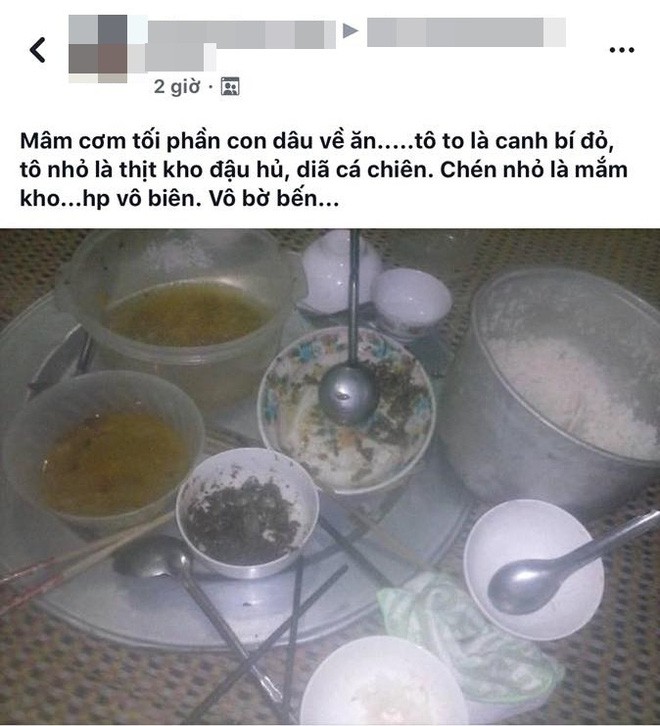 "Mâm cơm tối phần con dâu về ăn… Tô to là canh bí đỏ, tô nhỏ là thịt kho đậu hũ (đậu phụ), đĩa cá chiên. Chén (bát) nhỏ là mắm kho. Hạnh phúc vô biên, hạnh phúc vô bờ bến".