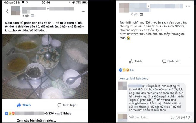 - Nhìn mâm cơm muốn khóc quá. Bố mình mà thấy mình phần cơm ai thế này chắc úp cả cái mâm vào mặt mình ý, phần người chứ có phải phần chó đâu mà làm thế.