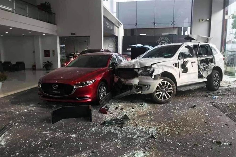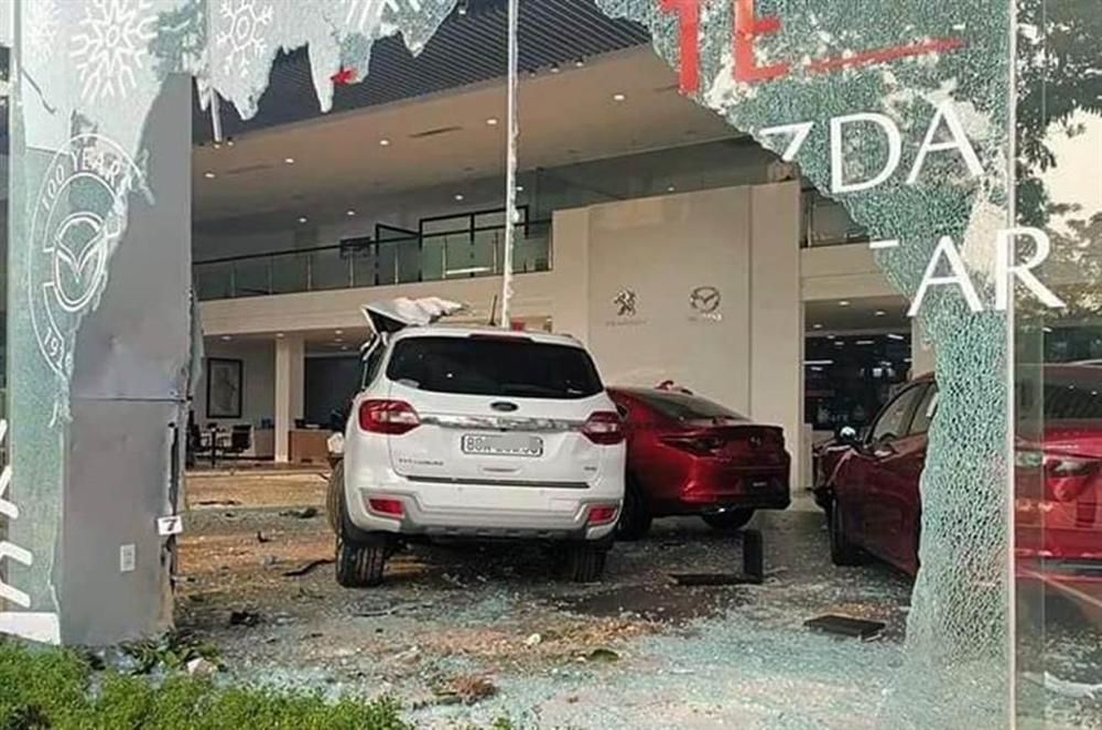 Tại hiện trường, ôtô nát đầu, nhiều mảnh kính vỡ vụn trên vỉa hè. Một chiếc xe trưng bày bị tông trúng, hư hỏng.
