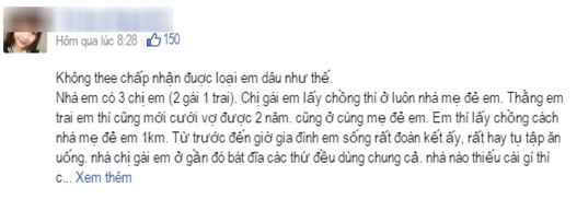 Thành viên Lan Chip tỏ ra đồng tình với cách ứng xử của cô em dâu hơn là chỉ trích theo người chị chồng: “Mỗi người mỗi tính, mình cũng rất ghét chung đụng. Bát đũa nhà mình mà bị người khác mượn, xong không có ý thức đem trả, lúc cần dùng lại chẳng có, phải bạn thì bạn có tức không. Chị em ruột thịt thì bạn thấy không sao, nhưng bạn cũng đi làm dâu như em ấy, sao bạn không thử đặt mình vào vị trí em dâu rồi hãy chê người ta ích kỷ”.