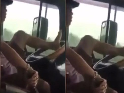 Trong lúc lái xe, tài xế ngang nhiên ngả người ra ghế, miệng phì phèo hút thuốc và dùng chân điều khiển vô lăng bất chấp nguy hiểm