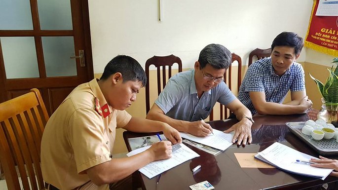 Tài xế Lê Đức Khổng giải quyết vi phạm tại Đôi CSGT số 3.