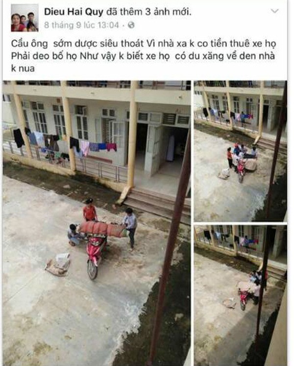Theo đó, ngày 8/9 người dùng facebook có tên Dieu Hai Quy đăng hình ảnh và viết những dòng cảm xúc đầy xót xa: “Cầu ông sớm được siêu thoát vì nhà xa không có tiền thuê xe họ phải đèo bố họ như vậy; không biết xe họ có đủ xăng về đến nhà không nữa". Kèm theo đó là những hình ảnh người nhà đang bó chiếu thi thể một người lên đằng sau xe máy để chuẩn bị chở đi.