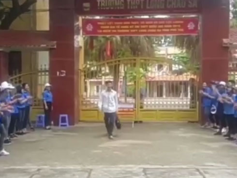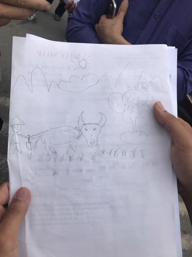 Sau khi ra khỏi cổng trường Đại học Công nghiệp Hà Nội, nam sinh ra đầu tiên tại điểm thi này đã giơ cao tờ giấy nháp vẽ hình ảnh con trâu, chiếc cày trên cánh đồng.