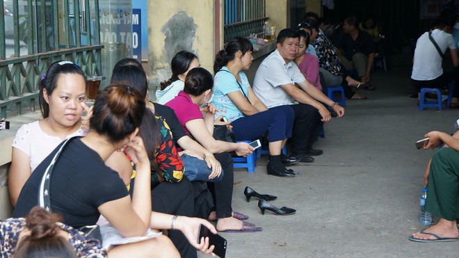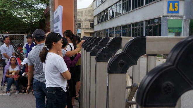 Các bậc phụ huynh ngồi đợi con em mình trong thời gian thi môn Toán buổi chiều 25/6, tại điểm trường ĐH Công nghiệp.