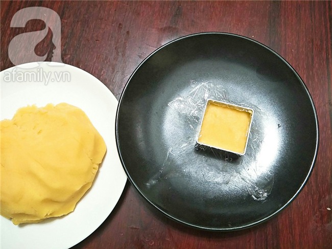 Để đậu nguội bớt, bạn lấy 1 cái khuôn vuông để đóng bánh, lót màng bọc thực phẩm vào khuôn sau đó lấy 1 lượng đậu xanh vừa với khuôn, ấn chặt các góc cho mặt bánh bằng phẳng.