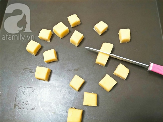 Lấy bánh đậu xanh ra thớt, dùng dao cắt thành các miếng vuông đều nhau, vậy là những chiếc bánh đậu xanh nhỏ xinh đã hoàn thành.