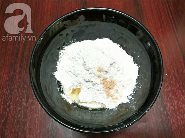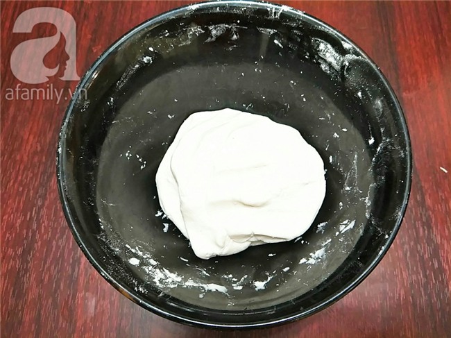 Cho nước ấm vào tô bột và trộn đều sau đó dùng tay nhồi bột cho tới khi thành 1 khối bột mịn dẻo, bọc kín tô bột và để bột nghỉ 15 phút.