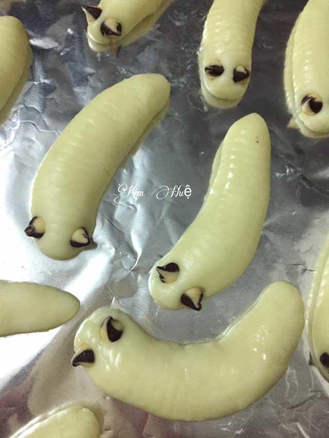 Đầu tiên, hãy hoà lẫn bột khô vào với nhau rồi rây lại cho thật đều. Tiếp theo là đun sôi cốt dừa, đổ từ từ vào bột nhào đến khi bột không dính tay, có độ dẻo. Đem vê dài thành hình con sâu, lăn qua răng lược để tạo thành các rãnh. Lấy socola chip để làm mắt sâu. Lót giấy chống dính khay, đặt bánh vào rãnh thứ 2 từ dưới lên của lò. Nướng 100 độ trong 30 phút là hoàn thành.