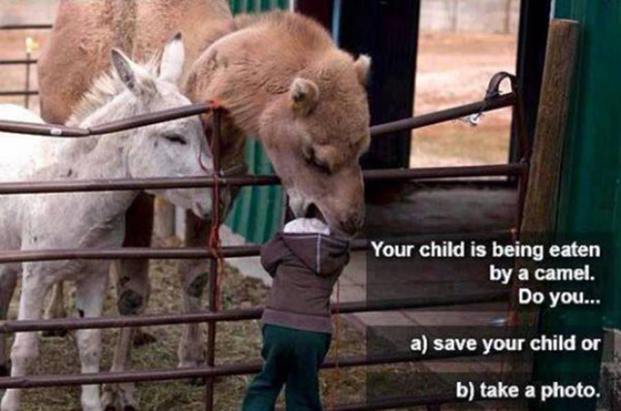 Cậu con trai đang bị cắn bởi một con lạc đà. Bạn sẽ cứu con hay đứng chụp ảnh?