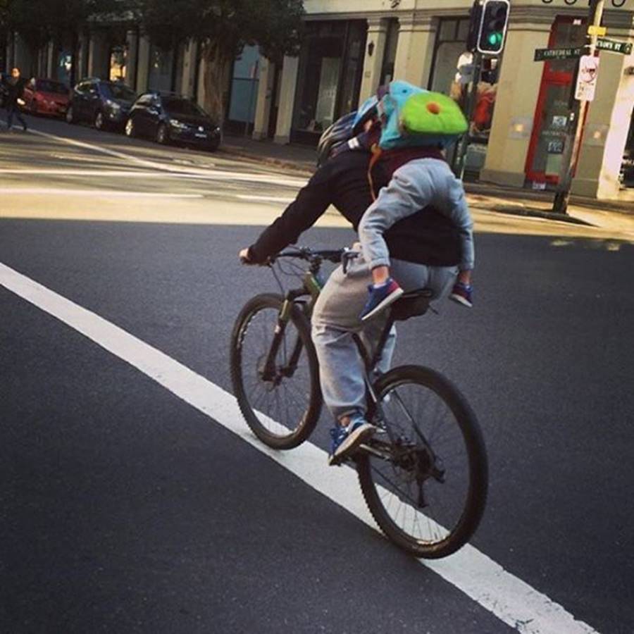 Một ông bố người Mỹ đã cho con trai bám lên lưng mình trong khi đạp xe mà không hề có bất cứ đai an toàn nào.