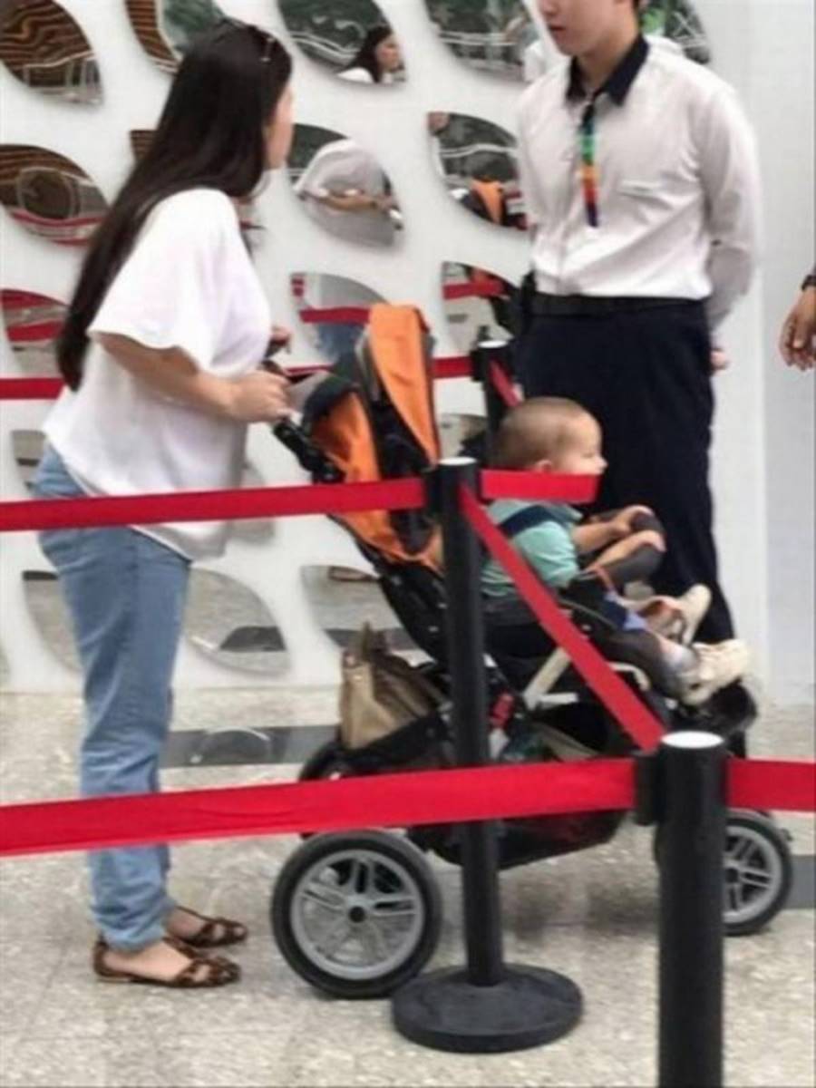Cậu bé bị vướng mặt vào trong rào chắn ở trung tâm trong khi người mẹ mải nói chuyện với nhân viên.