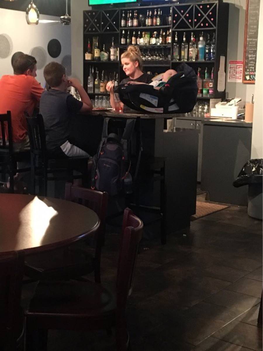 Đưa con vào trong quán bar, trong khi đó là nơi có quy định nghiêm ngặt về độ tuổi? Một em bé được đặt trong nôi trên bàn ở quán bar trong khi bố mẹ ngồi uống rượu ở ngay bên cạnh.