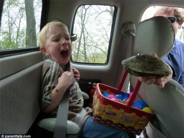 Ông bố này đã dọa con sợ chết khiếp khi cậu bé vẫn đang mắc kẹt ở ghế sau và bố thì đưa ra 1 con rùa để dọa cậu bé.