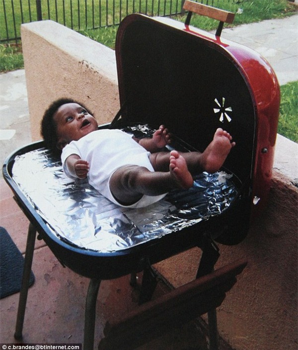 họ cho con nằm trên vỉ nướng, họ cho con nghịch cát, bôi đầy khắp mặt.