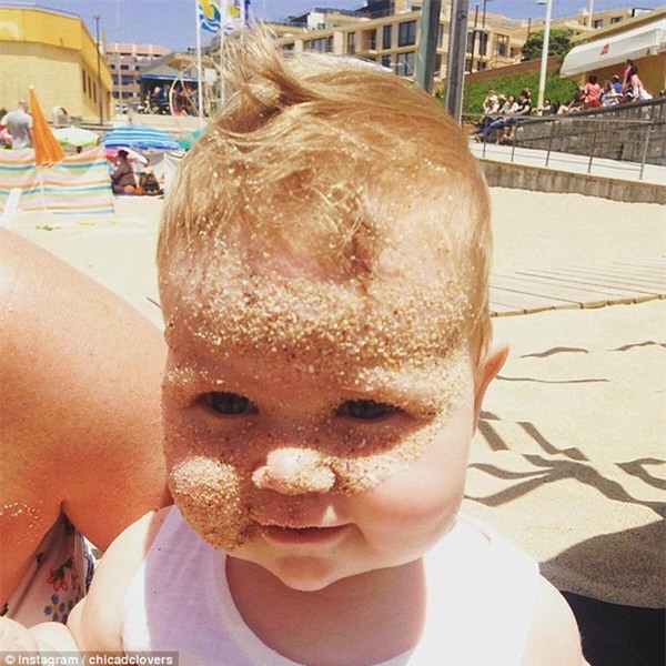 Khuôn mặt của cô bé dính đầy cát. Thật nguy hiểm nếu cát vào trong mắt bé.