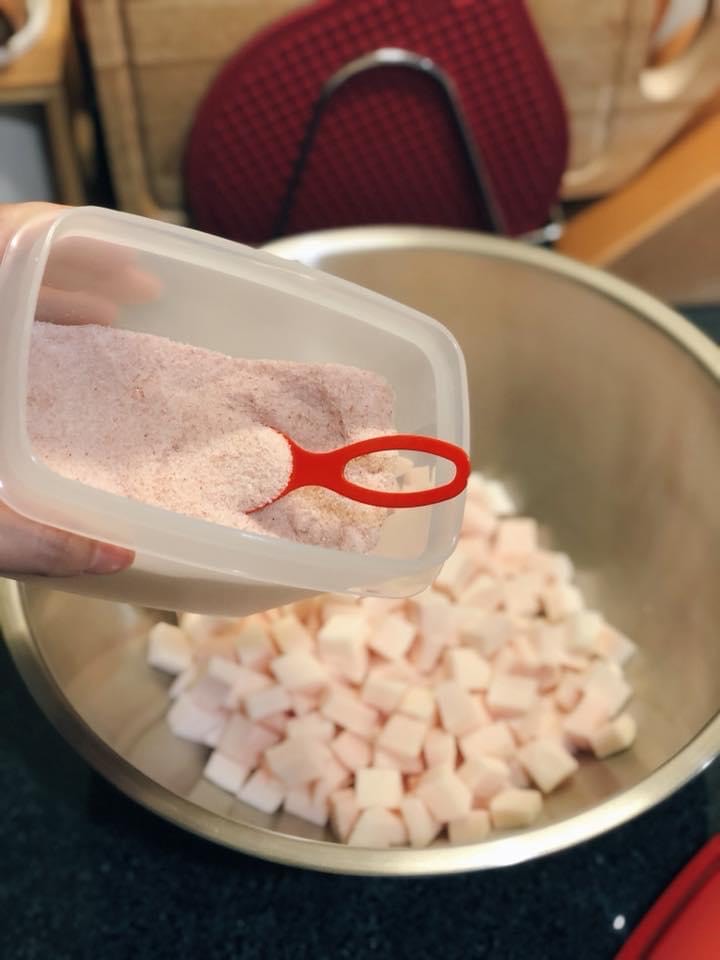 - Rắc bột năng vào cùi bưởi lúc còn nóng. Lắc đều để bột năng bao quanh cùi bưởi 1 lớp áo bột mỏng. Để ra đĩa.