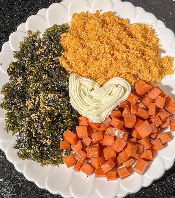 Ít xúc xích, dăm bông cắt nhỏ, chà bông.