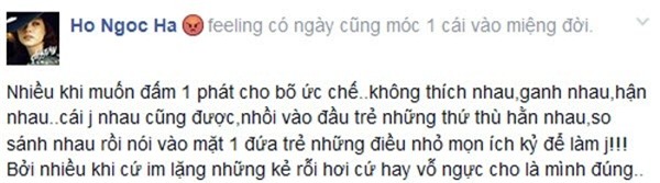 Trước đây, Hồ Ngọc Hà cũng từng bày tỏ sự bức xúc của mình về điều này trên trang cá nhân. Cô cho biết mình ức chế đến mức "muốn đấm cho một phát" vì con mình bị nhồi vào đầu, nói vào mặt những điều không hay. Cũng "may" là cậu nhóc hay được mẹ chỉ dạy nên đối mặt với thị phi ra sao.