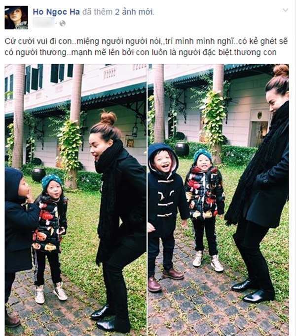Khi bị cho là biểu diễn ca khúc "Xin hãy thứ tha" theo phong cách phản cảm, người đẹp 8x chọn cách lặng im và đi chơi với con. Khi xuất hiện tin đồn tan vỡ với Cường đô la, bà mẹ 1 con cũng đi chơi với con một mình. Bị lộ ảnh đi chơi cùng đại gia kim cương, Hồ Ngọc Hà lại đăng ảnh và tâm tình “ngọt ngào” bên con trên trang cá nhân.