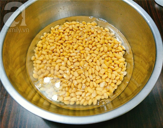 Đậu nành đem nhặt hết hạt bị hỏng rồi vo sạch rửa lại nhiều lần sau đó ngâm hạt đậu nành trong nước khoảng 6 tiếng cho hạt đậu nở to, đổ ra xả nước và rửa lại, để cho ráo nước.