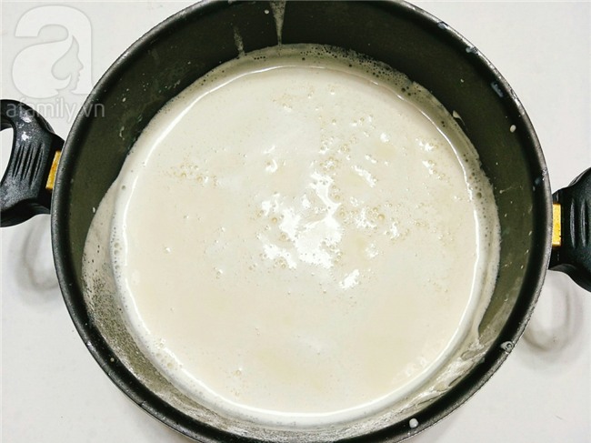 Bật bếp nấu cho nồi sữa sôi lên thì hạ lửa nhỏ và hớt hết bọt nổi trên mặt sữa, thêm 1 xíu muối và nấu vài phút cho sữa đậu chín hoàn toàn thì tắt bếp, vớt lá gelatin cho vào nồi sữa khuấy đều cho gelatin tan hết.