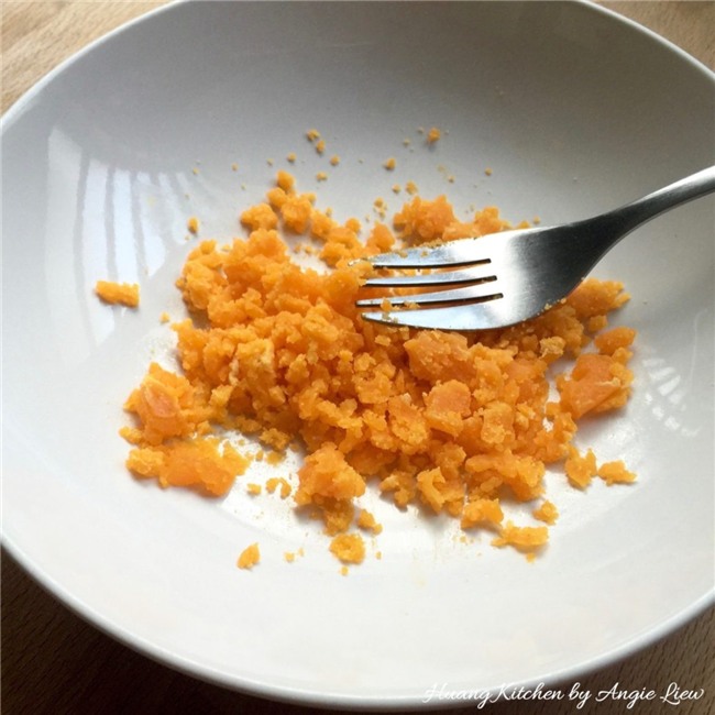 Đem 2 lòng đỏ trứng muối đi hấp chín, sau đó dùng nĩa nghiền mịn.