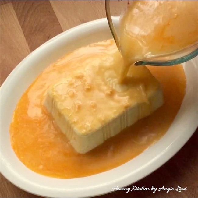 Lấy đậu phụ non ra khỏi hộp, đặt lên đĩa sâu lòng, rưới hỗn hợp sốt trứng muối lên trên.