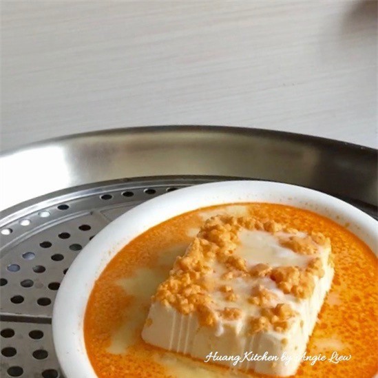 Đặt đậu phụ vào trong nồi hấp, hấp ở lửa vừa khoảng 10 phút hoặc tới khi thấy hỗn hợp sốt trứng muối sánh lại chín vàng là được.