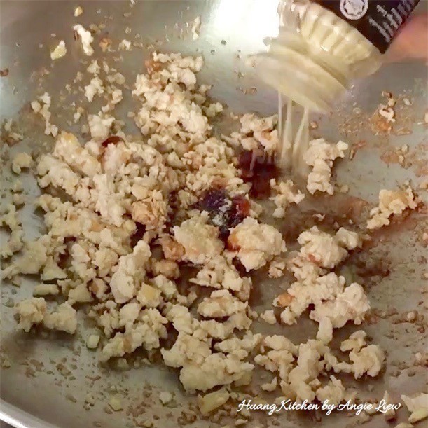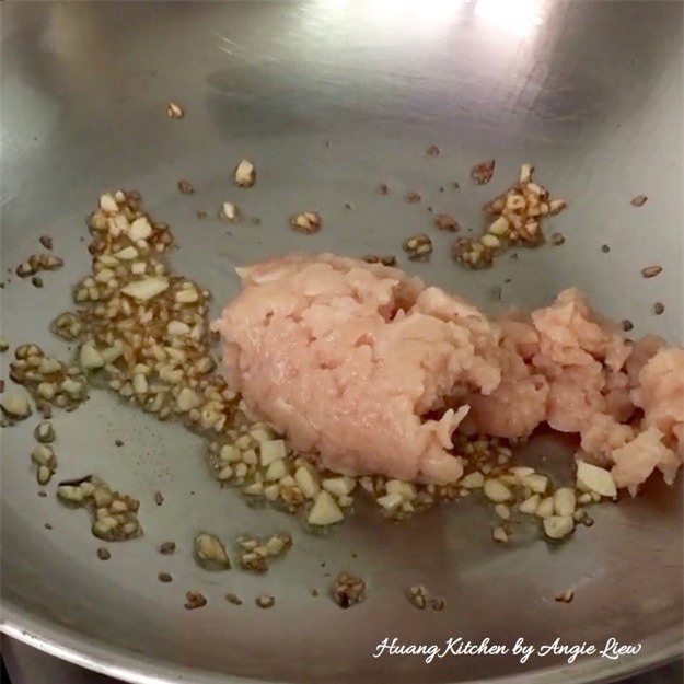 Vẫn dùng chảo đó, cho tỏi băm vào phi vàng rồi cho thịt băm vào, thêm tất cả phần nguyên liệu sốt cho thịt băm vào xào chín.