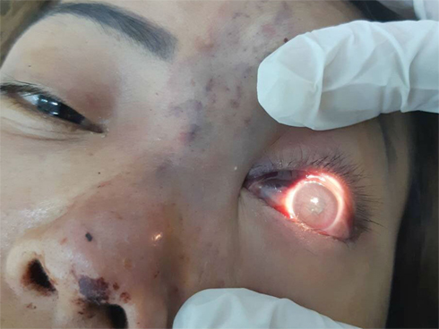 Ngày 17/7/2018, bệnh nhân P. (nữ, 30 tuổi) được chuyển đến Bệnh viện Trưng Vương (TP.HCM) trong tình trạng: da căng, sưng bầm vùng mũi và mắt trái, có dấu hiệu tắc mạch và hoại tử dẫn đến mù vĩnh viễn.