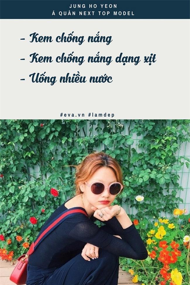 Á quân Next Top Model 2013 của Hàn quốc Jung Ho Yeon cũng dùng hơn một sản phẩm chống nắng để đạt hiệu quả cao nhất. Đầu tiên, cô thoa một lớp dày kem chống nắng của thương hiệu cao cấp, sau đó mới tới các loại kem chống nắng dạng xịt. Ngoài ra, cô sẽ đảm bảo uống thật nhiều nước giống như một cách bảo vệ cơ thể từ bên trong.